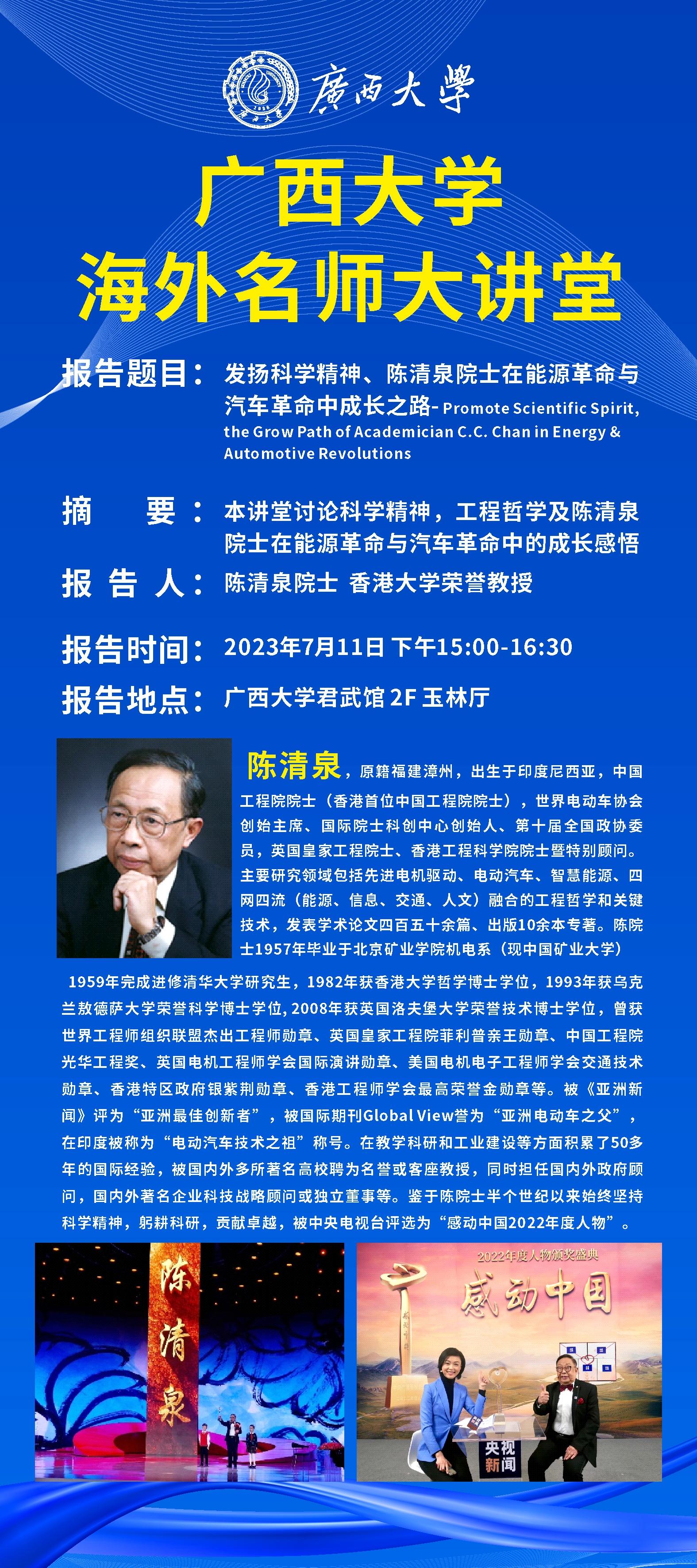【海外名师大讲堂】发扬科学精神、陈清泉院士在能源革命与汽车革命中成长之路