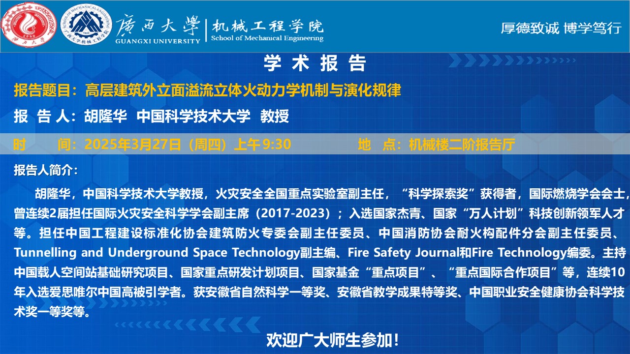 【机械工程学院学术报告】高层建筑外立面溢流立体火动力学机制与演化规律