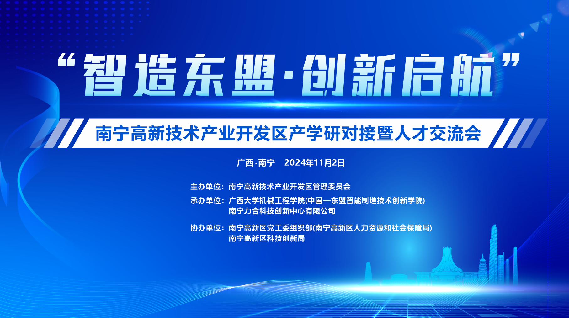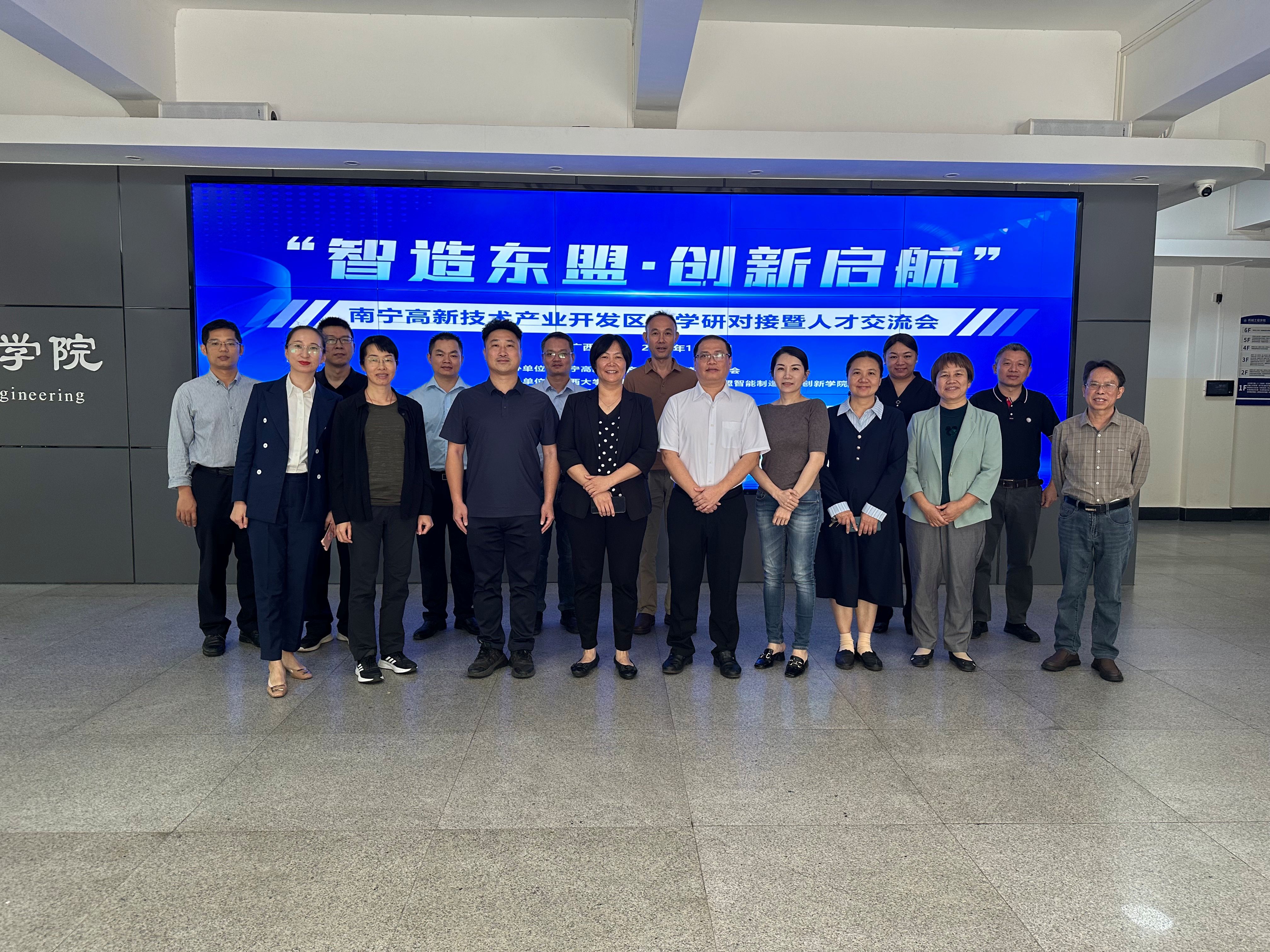 2024年11月2日上午,由南宁高新区主办、我院(中国-东盟智能制造技术创新学院)承办的“智造东盟·创新启航”——南宁高新技术产业开发区产学研对接暨人才交流会(广西大学专场)在学院第一会议室召开。出席交流会的有高新区委组织部(人社局)常务副部长(常务副局长)谢建木,高新区科创局、经发局、人才交流中心等部门负责人,玉柴机器、广西机械工业研究院、广西农业机械研究院、广西美斯达集团、南宁市神华振动时效技术研究院、深圳雾曼科技、南宁东创智能制造、南宁力合等8家企业代表,我院党委书记卢婵江等学院领导以及我院教师代表,共计30余人。