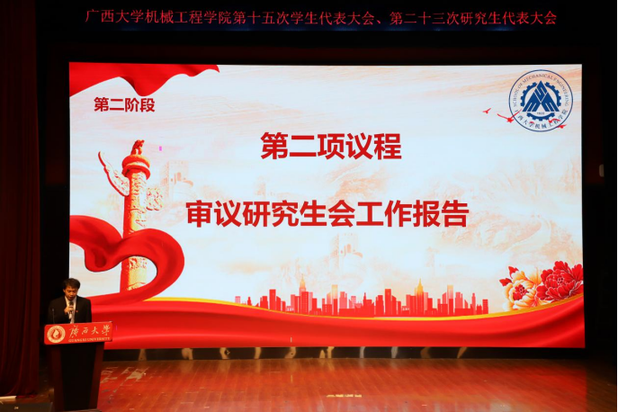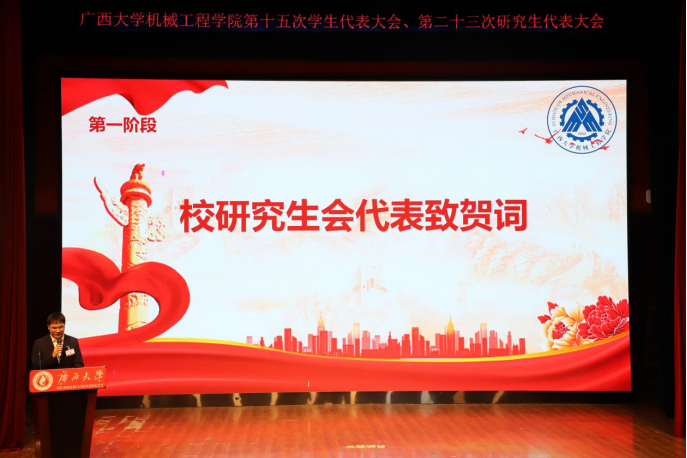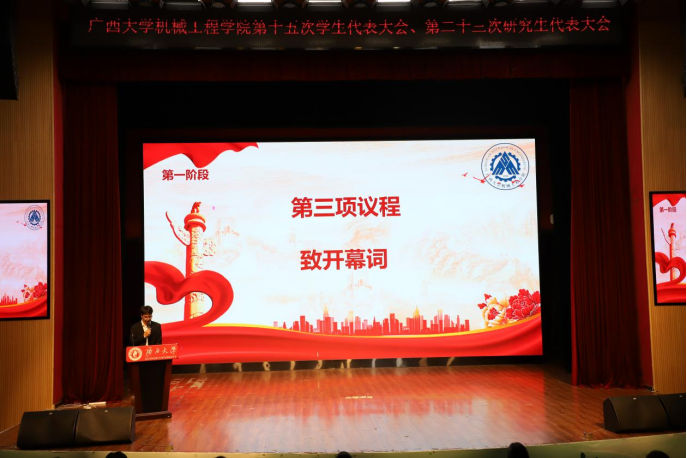11月2号下午,广西大学机械工程学院第十五次学生代表大会、第二十三次研究生代表大会在广西大学大学生活动中心小剧场胜利召开。院党委书记卢婵江、党委副书记黄路明、团委书记李华、团委副书记林超、学工组辅导员农婷婷、曾祥喜、校学生会、研究生会代表、各兄弟学院学生代表及我院学生代表出席大会。