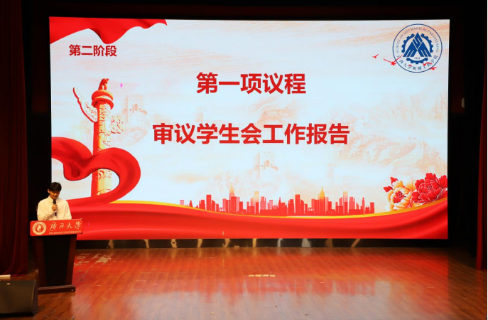 我院第十四届学生会主席团代表郭室辰作工作报告,他全面总结了过去一年学生会的工作成果和经验,并号召新一届学生会秉持初心、牢记使命,践行“勤恳朴诚,厚学致新”的校训和“厚德、致诚、博学、笃行”的院训,将学生会建设成一个思想过硬、组织高效、能力突出、服务贴心的先进组织,更好地引领和服务广大同学,为学院发展和中华民族伟大复兴贡献青春力量。