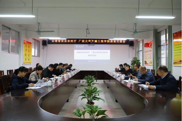 随后双方举行座谈交流。我院农机领域相关团队的专家参加座谈,座谈由卢婵江书记主持。卢书记首先对云南省农业农村厅调研团的到来表示热烈欢迎,其次简要介绍我校和我院在支撑广西甘蔗全产业链的学科特色。她强调,作为同属丘陵山区,气候等农业生态与产业构成相似,除甘蔗外在果蔬等多个领域合作空间广阔的相邻两省,在助力产业升级方面目标一致、基础扎实,在推动农艺与农机深度融合、丘陵山地智慧农机产学研推方面有很大的合作空间,期待未来在联合科研、良品推广、技术应用等方面加强合作、携手并进。蒋兴明副厅长表示,云南省正着力提升农业机械化水平,以保障粮食安全、推进农业现代化,此次来访的主要目的,一是诚挚邀请广西大学机械工程学院的专家团队携技术成果,参加即将在云南举办的全国丘陵山区农机研发推广现场会,进行展示交流;二是希望双方建立长效联络机制,加强科研合作与成果转化,共同推进适用于西南丘陵山区的农业机械研发与应用,助力云南农业机械化发展。最后环节是贺德强院长向来访团详细介绍了我校我院的发展历程、学科现状以及近年来在亚热带智能农机的研发成果等。