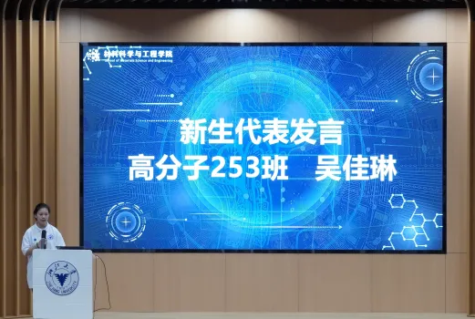 高分子 253 班吴佳琳作为新生代表,表达了对学校与学院的感恩之情,坦言对大学生活满怀憧憬,并坚定表示将以 “自主学习、主动探索” 为信条,在四年时光中脚踏实地、追求卓越。