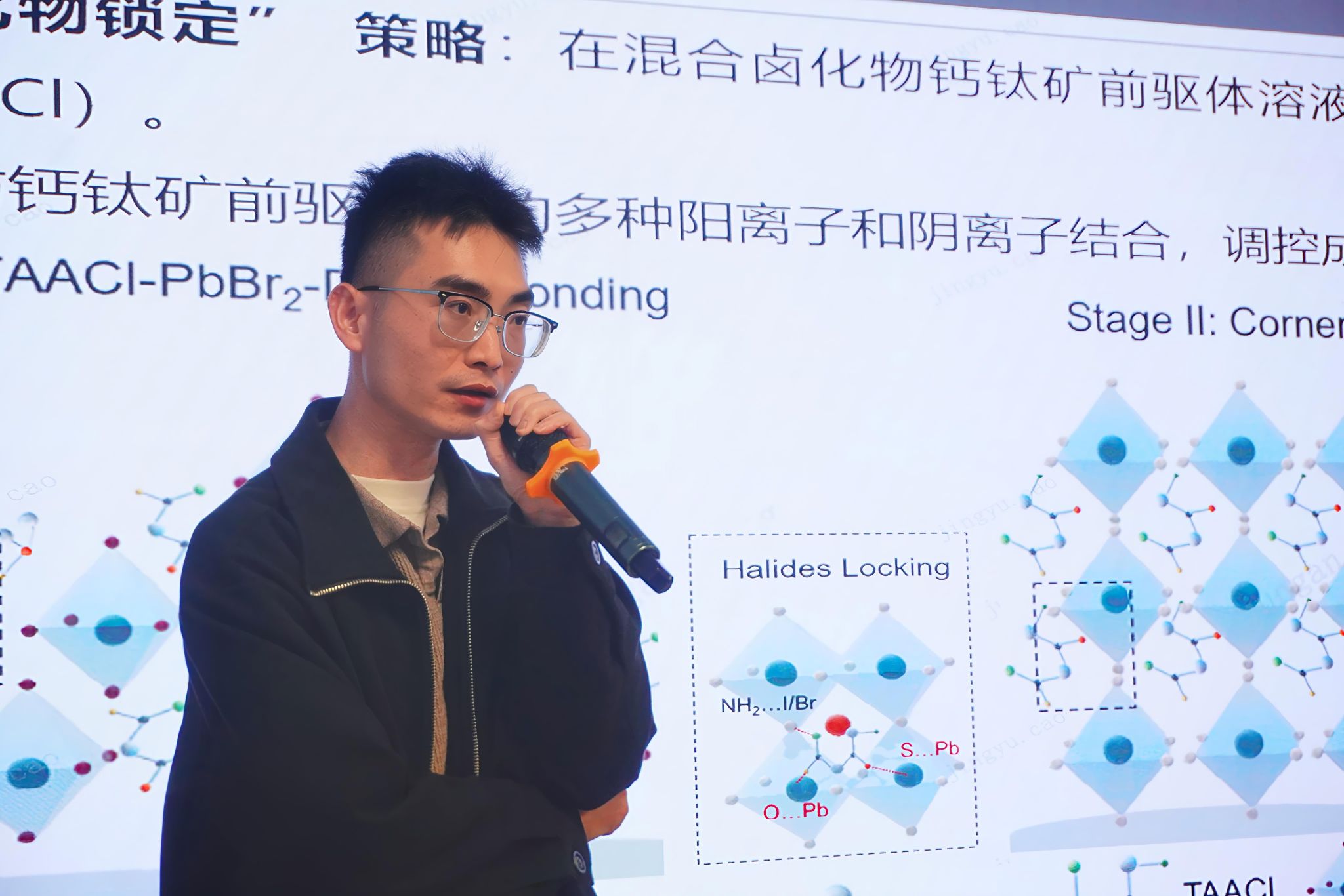 随后,晶科能源(海宁)有限公司电池研发中心主任工程师王俊淦博士以《高性能钙钛矿/TOPCon晶硅叠层电池技术进展》为题,他详细介绍了钙钛矿叠层电池效率进展以及钙钛矿/TOPCon叠层电池的技术体系,分享了其在提升光电转换效率极限方面的突破性进展与面临的挑战,为在座师生指明了前沿基础研究与应用开发的关键方向。