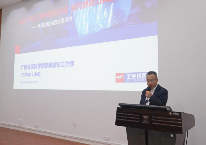 仪式结束后,全国劳模王辉从中国共产党人的精神谱系出发,结合自身扎根玉柴二十载、投身内燃机技术研发的奋斗历程作了生动的专题报告。他以团队在氢能发动机、自主控制器等领域的科技攻坚为例,报告中王辉劳模阐释劳模精神、科学家精神、工匠精神等中国共产党人精神谱系是团队勇闯技术“无人区”的核心精神动力,号召在场师生自信自强,砥砺前行。