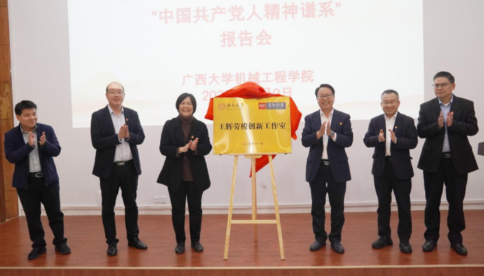匠心传承映初心,党建领航育新篇。2025年12月9日下午,“王辉劳模创新工作室”揭牌仪式暨“中国共产党人精神谱系”报告会在学院机二阶举行。活动分揭牌仪式、专题报告以及实验室参观三个阶段。校党委组织部副部长李道洋、校教务处副处长胡立坤、玉柴股份研发总院党委书记兼常务副院长寇传富、玉柴研发总院副院长王辉以及我院院长贺德强、副书记黄路明、副院长李俚、黄豪中等院党委领导出席。活动由院党委书记卢婵江主持。